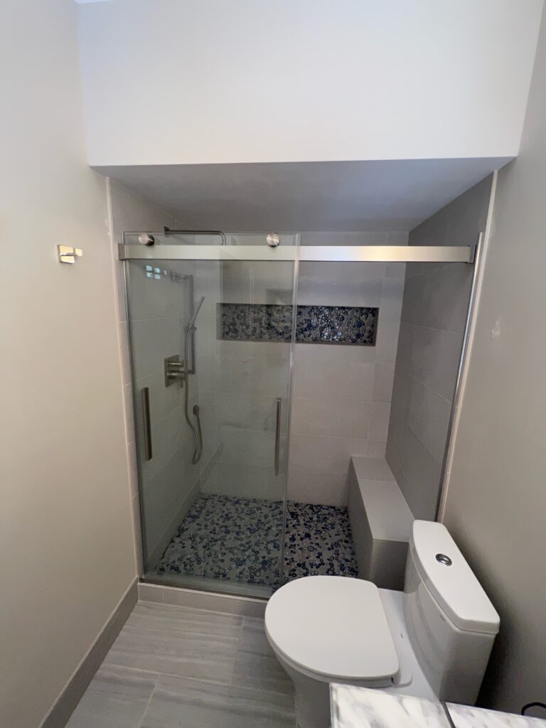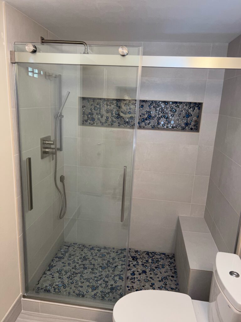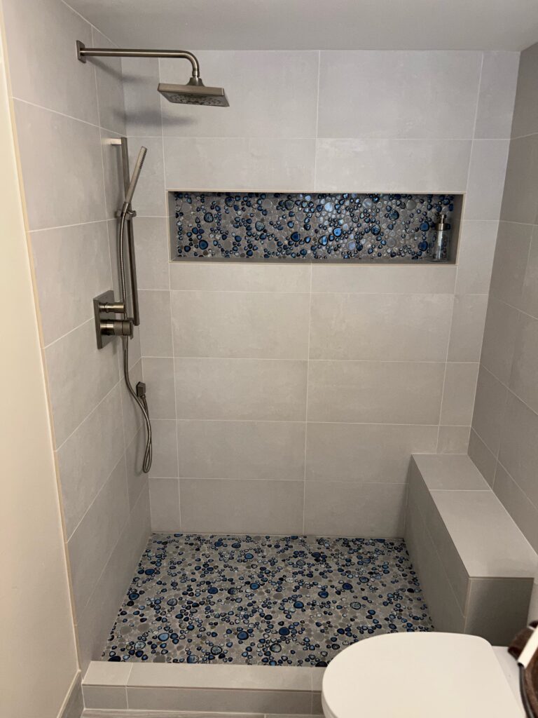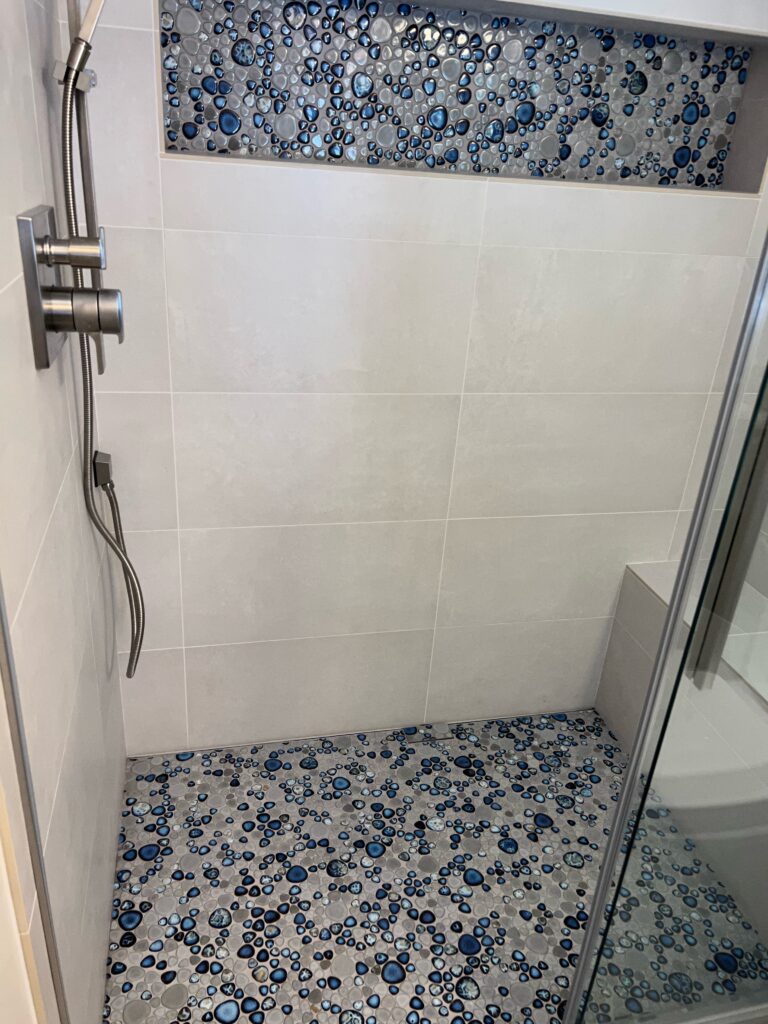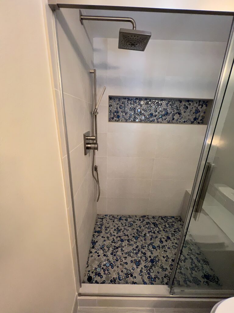 This project was unusual because we removed the old fiberglass shower, added a custom four foot niche, waterfall infinity drain, with custom pebbled glass tiles. This shower came out amazing and the homeowner loved it. We installed a specialty shower faucet with a hand-held separate sprayer.